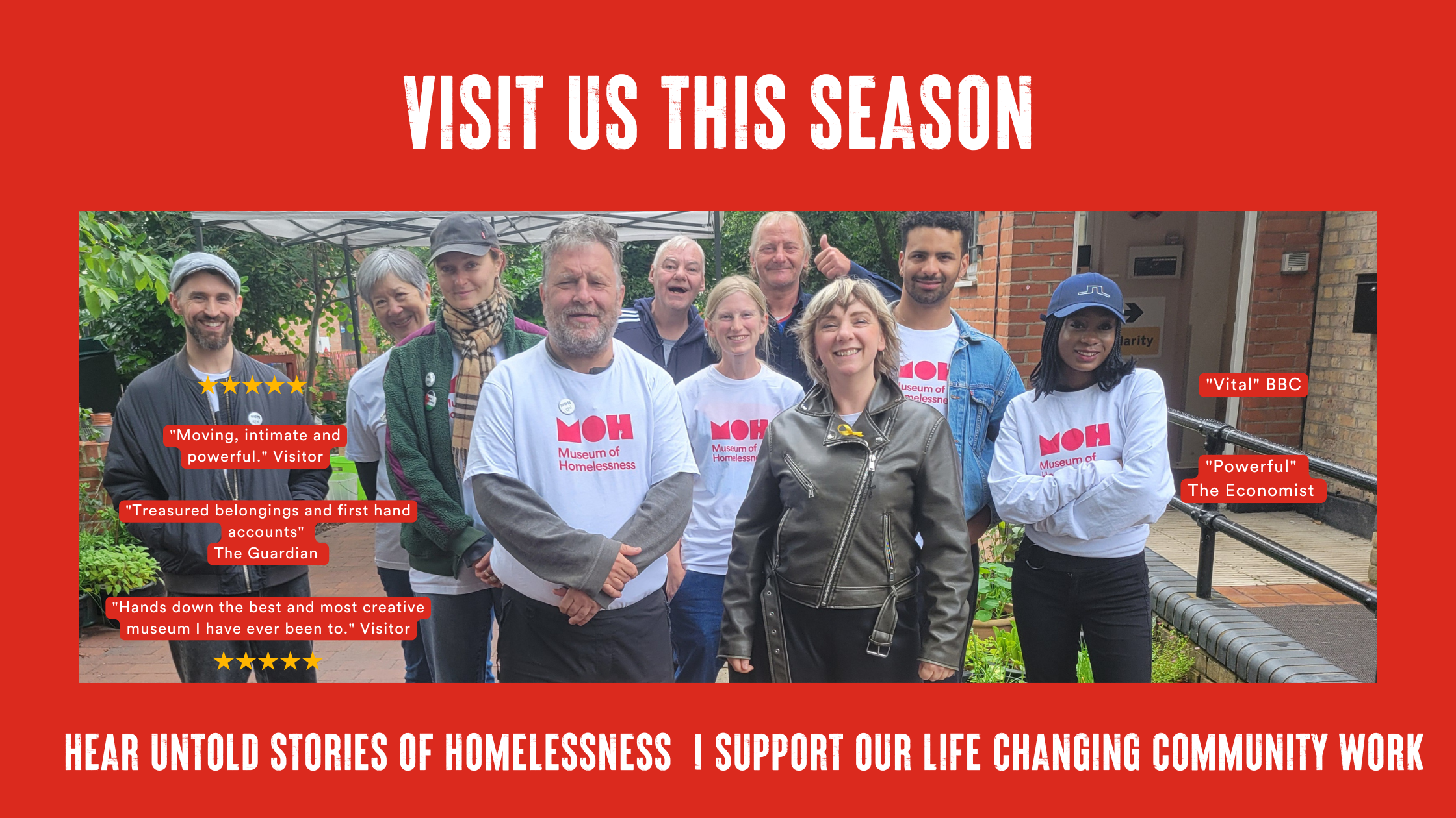 Museum of Homelessness is open for free ticketed public visits from April to November during 2025. Pre-booking is essential as our building has limited capacity.